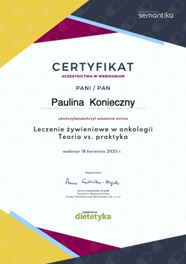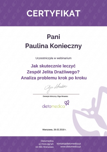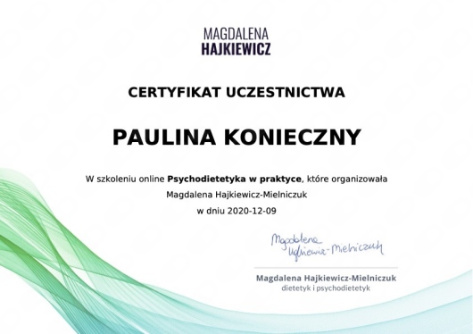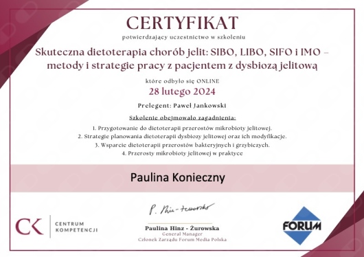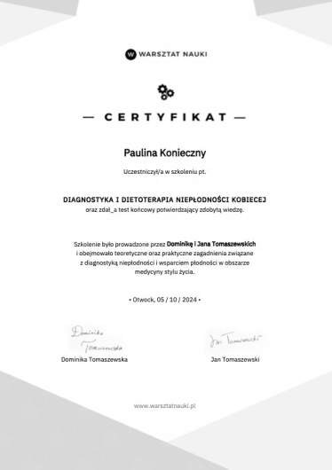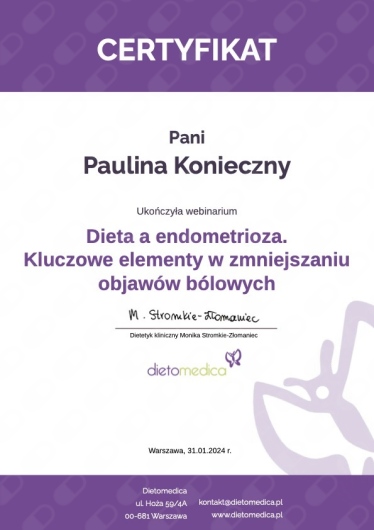 Nazywam się Paulina Konieczny. Jestem dietetyczką kliniczną i psychodietetyczką. Od kilku lat pracuję z kobietami, które zmagają się z zaburzeniami hormonalnymi, problemami jelitowymi oraz przewlekłymi objawami wpływającymi na codzienne funkcjonowanie i jakość życia.